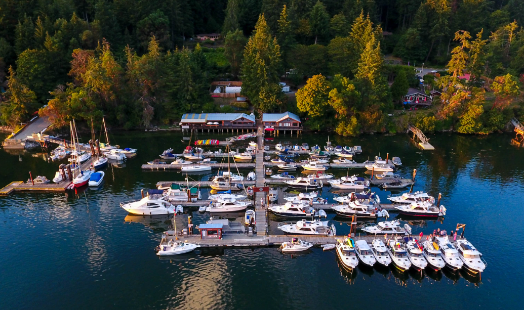 Montague Harbour Marina offers a fuel station with zero-ethanol gas and diesel, WiFi and garbage/recycling drop-off included with overnight moorage, 15 and 30 amp power, a well-stocked general store & market including a coffee shop, ice cream, produce, meat, seafood, fishing gear, bait, ice, books, clothing & gifts. No water on docks. Large dinghy dock available for any boaters on anchor or mooring buoys who want to enjoy the marina’s shopping and dining. Enjoy excellent meals on our licensed deck restaurant overlooking picturesque Montague Harbour and its spectacular sunset views. Open May 1 – Sept. 30. Moorage reservations are highly recommended. The Marina also offers Winter and Annual Moorage – see details below.